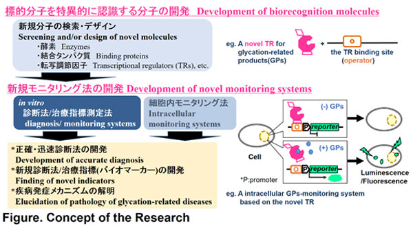 | Glycation takes place intra- / extracellularly and is implicated in glycation-related diseases, such as diabetes mellitus, Alzheimer’s disease and cancer, as well as aging process. We are engaged in the development of novel biorecognition molecules and in vitro or intracellular monitoring systems for glycation-related products. These systems are expected to be contribute to the development of novel diagnosis systems and biomarkers, as well as the elucidation of pathology of the glycation-related diseases. |