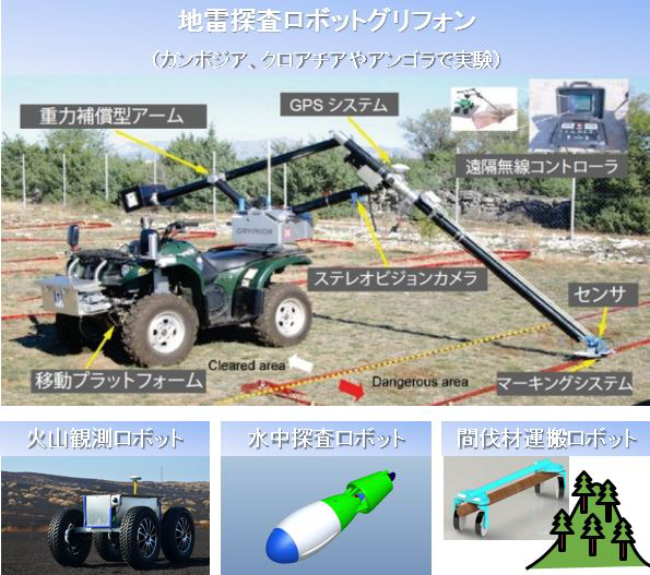 私の研究分野は、ロボティクス、いわゆるロボット工学になります。これまで私の研究室では、陸海空を問わず、各環境で役立つさまざまなロボットの研究開発に取り組んできました。例えば、長年、研究を続けているものに“地雷探査ロボット”があります。紛争によって地中に埋められた地雷を撤去する作業は、現在も人の手で地道に行われていますが、それをもっと効率化する方法がないか、具体的には時間短縮とコスト削減できないかと研究に取り組んでいます。