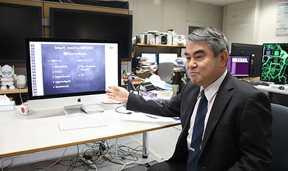 高校生・受験生の皆さんは、ブロックチェーンという言葉を耳にしたことがないかもしれませんが、これは少し前にニュースなどで取り上げられていた“ビットコイン”、いわゆる仮想通貨に使われている技術です。ブロックチェーンの特徴としては、電子化された価値ある資産が誰から誰に所有権が移ったのかといった情報をきちんと記録・管理でき、その情報をみんなで共有できるうえに確認もできて、改ざんすることが非常に難しいので信用がおけるという技術になります。また、バージョンが1.0から現状3.0まであって、簡単に言うと、ビットコインなどの仮想通貨に使われているのが1.0です。そして、ブロックチェーンを仮想通貨以外で使おうというのが2.0。例えば、アメリカのマサチューセッツ工科大学では、大学のオンライン授業で活用されています。ブロックチェーンを使って、誰がいつ、どこの大学でどの単位を取ったかを、いつでもだれでも確認できるようになっていて、単位を取ったことを簡単に証明できるわけです。それから3.0になると、スマートコントラクト、つまり契約が自動的にできるような仕様になっています。それを色々なことに応用しようと、今、世界中で実証実験が進められています。私たちも、このブロックチェーン3.0の技術を対象に研究を進めています。
