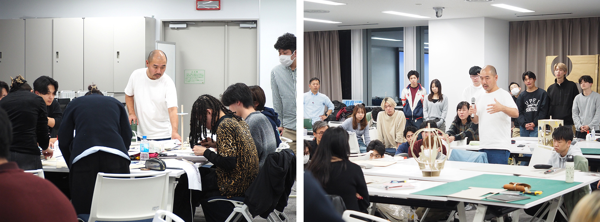 デザイン学部では、2025年12月15日(月)から17日(水)までの3日間、イギリスで活躍する日本人建築家 早津毅氏を特別講師として迎え、特別授業を開催しました。授業では、本学蒲田キャンパス最寄り駅である「蒲田駅」の駅ビル「東急プラザ蒲田」屋上の“幸せの観覧車”を題材とし、観覧車のゴンドラの新たなデザイン提案と模型制作に取り組みました。学生たちは事前に現地調査を行ったほか、東急プラザ担当者から観覧車の歴史についてレクチャーを受けるなど、十分な準備を重ねたうえで特別授業に臨みました。