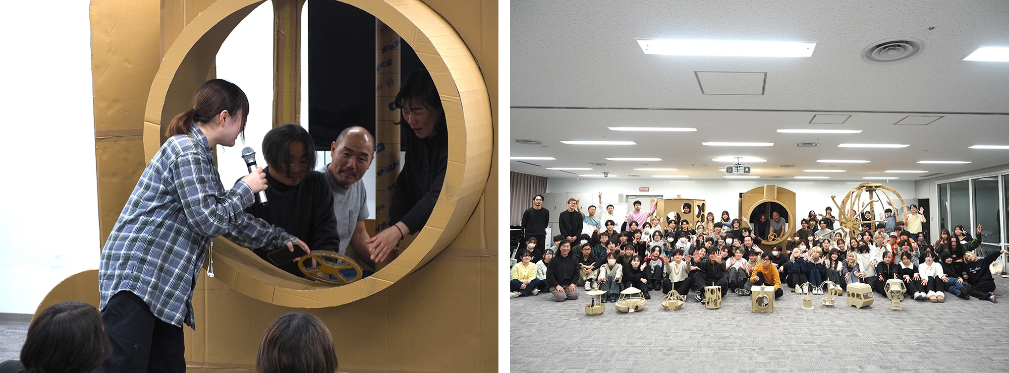 二日目は、選定された3案を原寸模型として制作。限られた時間の中で、学生たちは役割分担を行い、安全に配慮しながら急ピッチで作業を進めました。制作の途中では早津氏から随所で助言があり、最終的に3点の原寸模型が完成しました。特別ゲストとして寺田尚樹客員教授も登場し、仮に実物化するとした場合の素材や色彩のあり方から、今後の展示や稼働時を見据えたイメージムービー制作に至るまで、講評をいただきました。