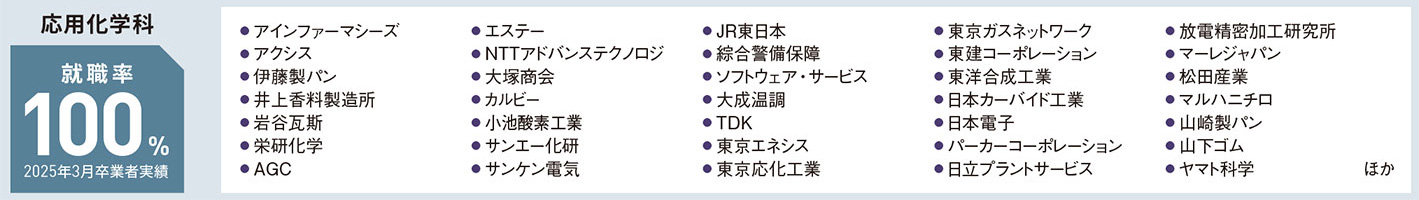 学科紹介文応用化学科では、資源の枯渇や環境負荷の増大など、現代社会が抱える問題を化学の力で解決し、サステイナブル社会を拓く教育と研究を進めています。有機化学、物理化学、無機化学などの専門分野にバイオテクノロジーも加えて、最先端の分析機器を使用し、高度な実験を行ないながら学習できる環境を整えています。応用化学科は、化学の力を生かして未来社会に貢献する人材を育成します。