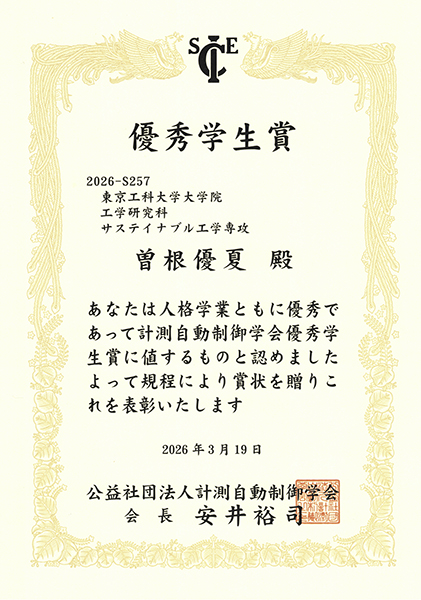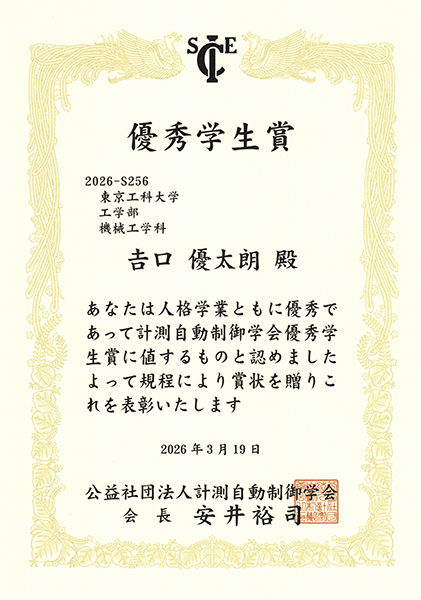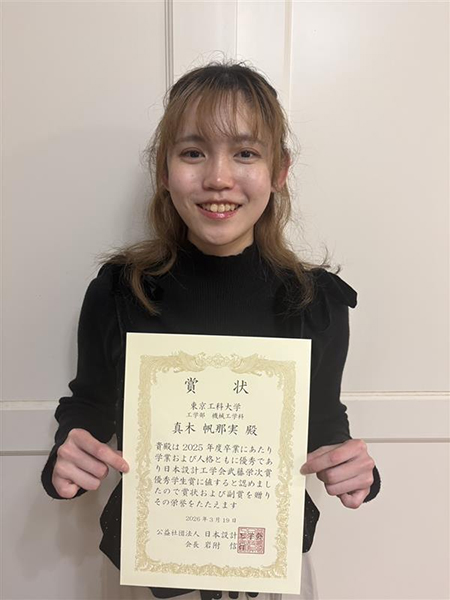 機械工学科において、各学会の賞を以下の学生が受賞しました。日本設計工学会武藤栄次賞優秀学生賞:荒井大地(福島研)、日本ロボット学会優秀学生賞:本間勇樹(松尾・上野研)、電気学会東京支部電気学術女性活動奨励賞:中尾根美樹(大久保研)