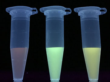| We are developing artificial DNAs and RNAs with unique functions and applying them to new diagnostic technologies, molecular-imaging technologies for cell surface and intracellular substances, and even drug discovery. For example, we made DNAs and RNAs that fluoresce like fluorescent proteins, and are studying their applications. Specifically, we are developing functional RNAs that fluoresce when bound to intracellular substances related to disease and aim to use them for screening for new drugs. |