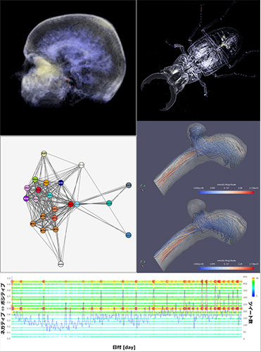 | Computer visualization, which enables visual analysis of large and complex datasets, has become one of the indispensable technologies for data analysis in recent years. However, to obtain meaningful visualization results, it is necessary to devise visualization methods that suit the purpose of visualization and the characteristics of the target dataset. In this project, research on visualization is conducted from various perspectives, including clarification of phenomena and what kind of visual representation will make it easier for users to obtain worthy information. Our research themes range from science, engineering, medicine, marketing, and entertainment. Our goal is not only to create beautiful images but also to create visualization technologies that enable users to grasp the information contained in the target data. |