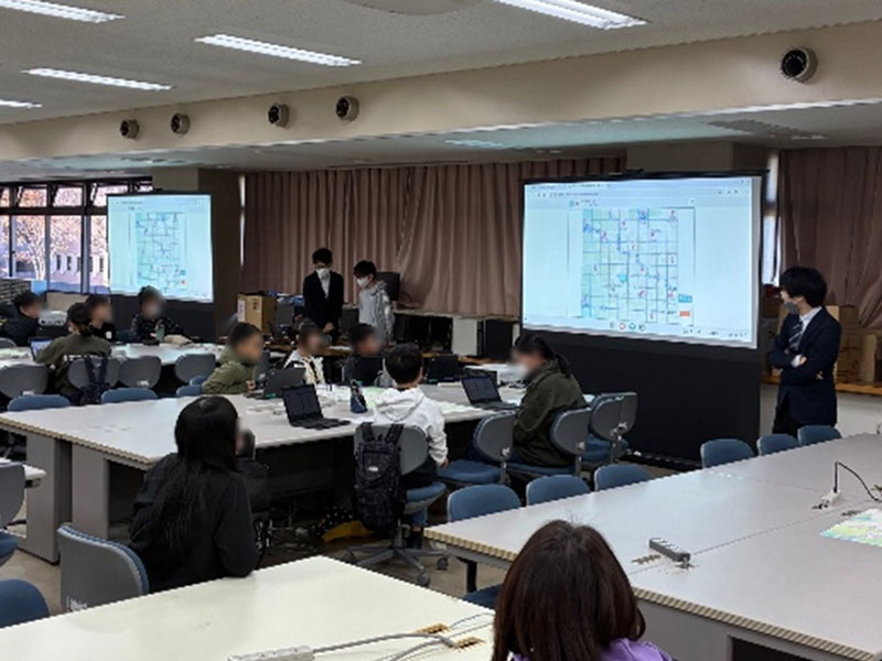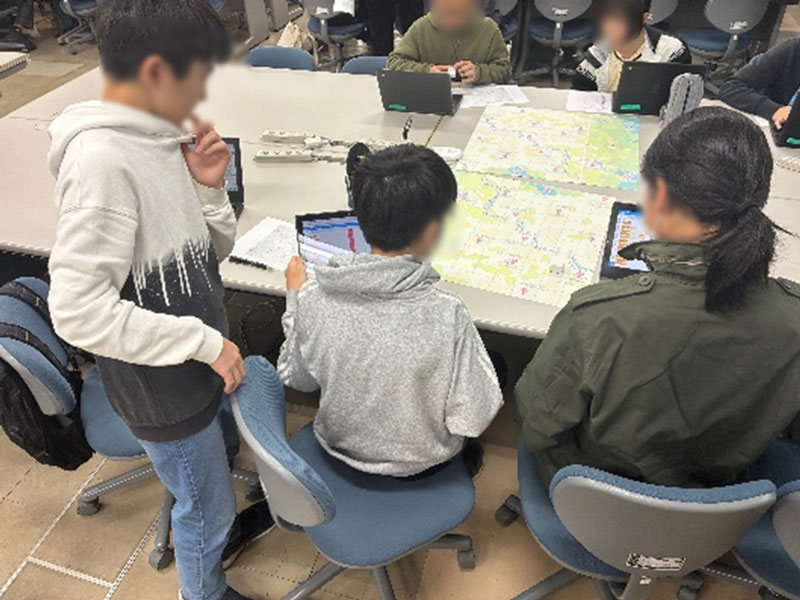 その後、中学生の皆さんはグループに分かれ、課題に挑戦しました。今回の課題は、地図上に設定された複数のチェックポイントを、キューブ型ロボットが60秒以内にどれだけ多く通過できるかを競うものです。 グループ内で積極的に話し合いながら最適なルートを求め、試行錯誤を重ねてプログラムを作成しました。得点を更新した際には、歓声が上がり、うまくいかないときには原因を分析して改善するなど、真剣な表情で取り組む姿が印象的でした。 自分のプログラミングした結果が、画面上ではなく、実際に動く様子を体験してもらうことで、プログラミングの楽しさや論理的思考の大切さを実感してもらえたと思います。
