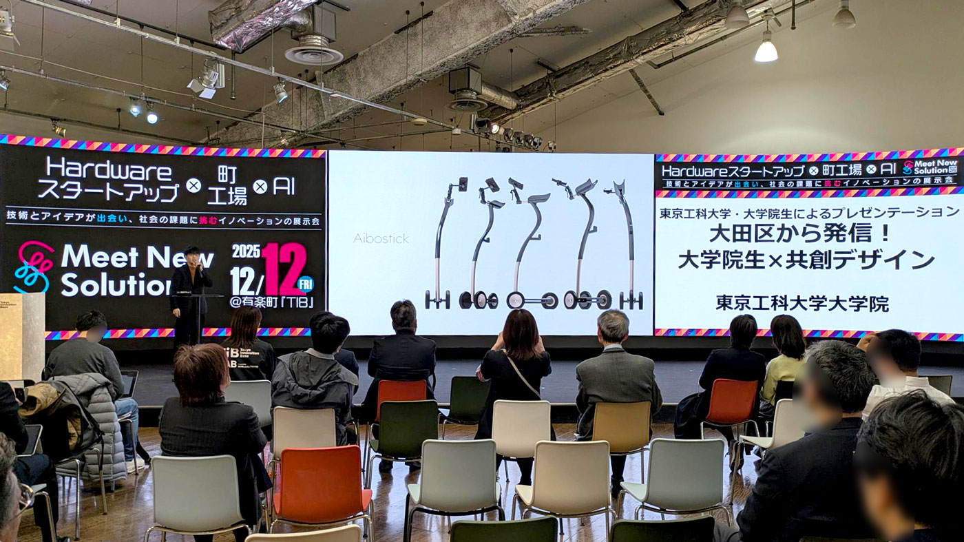 こうした連携の一環として、2025年12月12日(金)に丸の内で開催された展示・発表イベント「Meet New Solution in TiB(主催:大田区、大田区産業振興協会)」において、大学院デザイン研究科1年 新居 怜弥さんと尾崎 悠耶さんが発表を行いました。