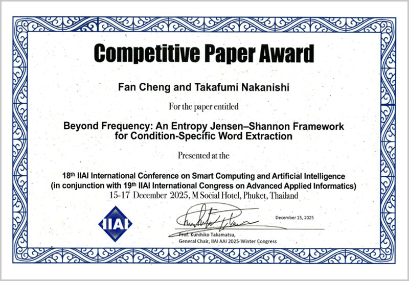 本学コンピュータサイエンス学部 TransMedia Tech Lab(中西崇文教授 研究室) に所属する博士課程学生 程 凡(Cheng Fan)さんが、国際会議 IIAI AAI 2025-Winter(タイ・プーケットで開催)において発表した研究論文「Beyond Frequency: An Entropy–Jensen–Shannon Framework for Condition-Specific Word Extraction」が高く評価され、Competitive Paper Award(上位論文賞)を受賞しました。