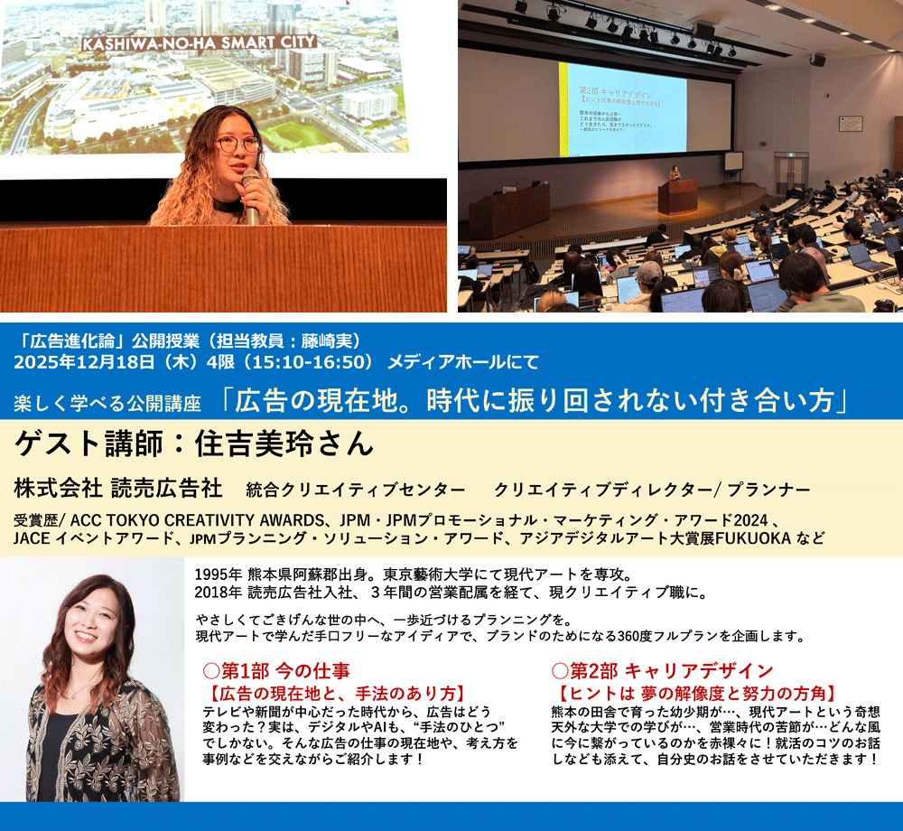 藤崎実メディア学部准教授の授業で、読売広告社の住吉美玲氏が特別講義!