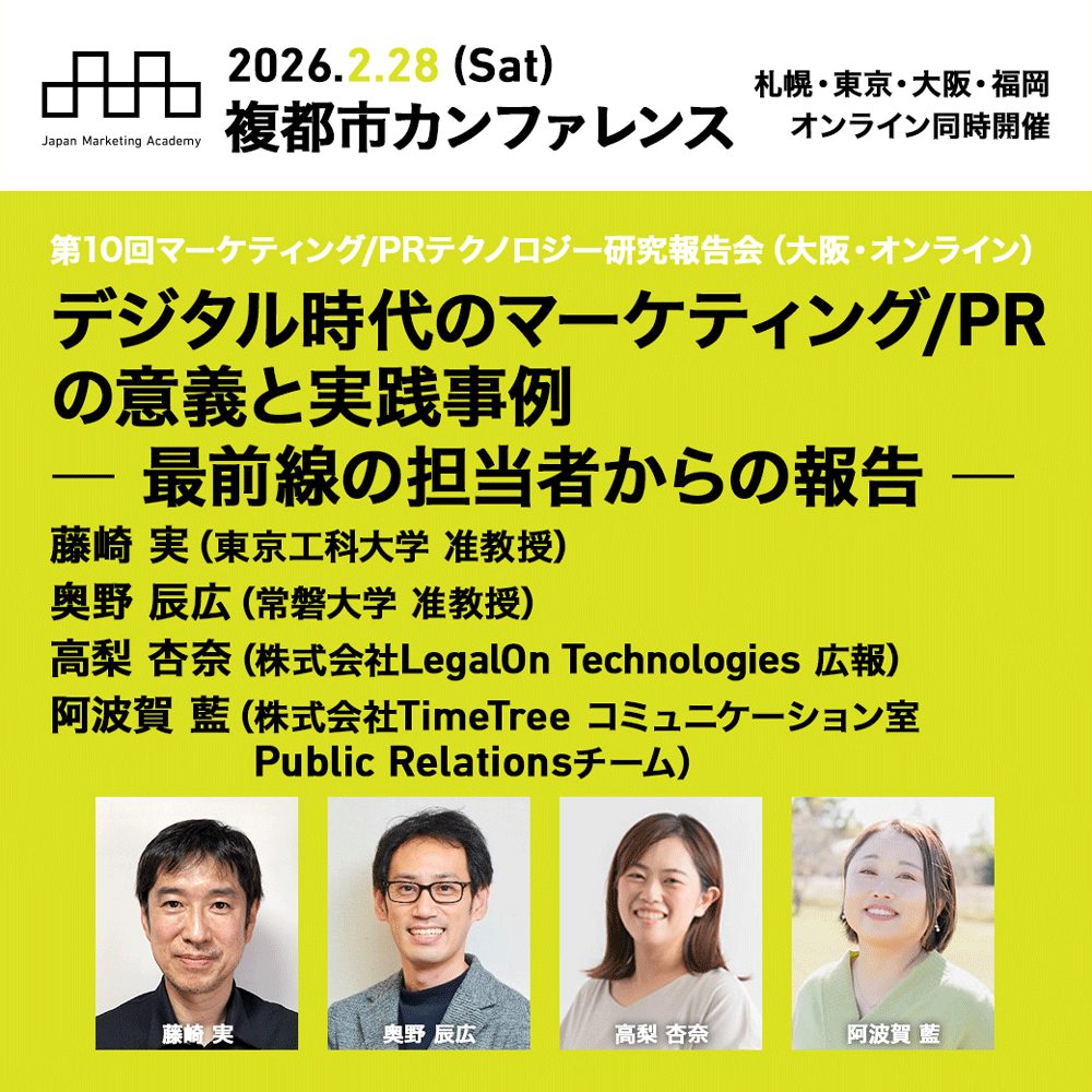 2026年2月28日(土)、日本マーケティング学会が主催する「複都市カンファレンス2026」が開催されました。大阪会場(武庫川女子大学)およびオンラインのハイブリッド形式で行われる本カンファレンスにて、メディア学部の藤崎 実教授がリーダーを務める「マーケティング/PRテクノロジー研究報告会(第10回)」が実施されました。