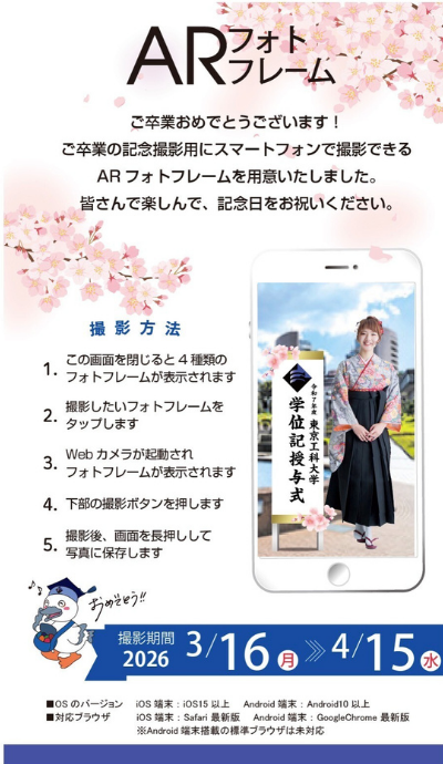 ARフォトフレームは、スマートフォン等で二次元コードを読み取る(またはURLからアクセス)ことで、看板やフレーム等が入った記念撮影が簡単にできるものです。利用期間内であれば、式典会場や大学構内に限らず、ご自宅等学外でもご利用いただくことができます。