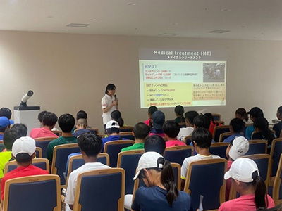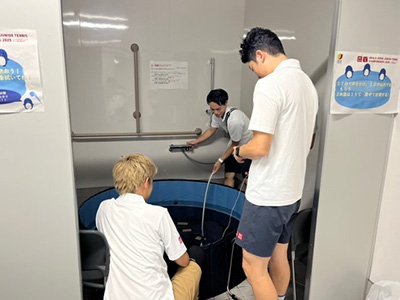 今回のメディカルサポートでは、試合中の体調不良や怪我に対するコートコール対応、試合前後の選手へのコンディショニング(ストレッチ、テーピングなど)、さらに熱中症予防の啓発やケア(アイスバス導入など)を実施しました。加えて、大会では「チャンピオン教育」としてジュニア選手やそのコーチ、保護者を対象にした教育セッションも行われ、伊藤がITF(国際テニス連盟)のメディカルルールについて講演しました。