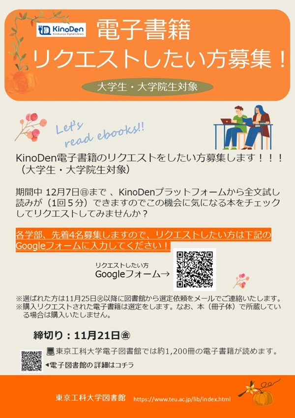 10月7日(火)~12月7日(日)の期間限定で、電子書籍「KinoDen」の全文試し読み(1回5分)と 「KinoDen」プラットフォームから、未所蔵の電子書籍の購入リクエストが行えます。