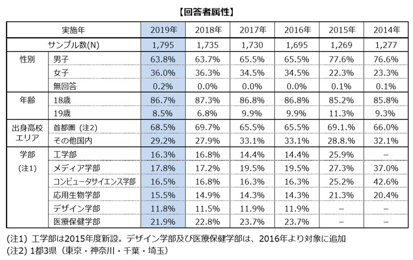 | 調査方法: | 新入生ガイダンスにて調査票を配布・回収 ※入学者全員とは若干異なります | |