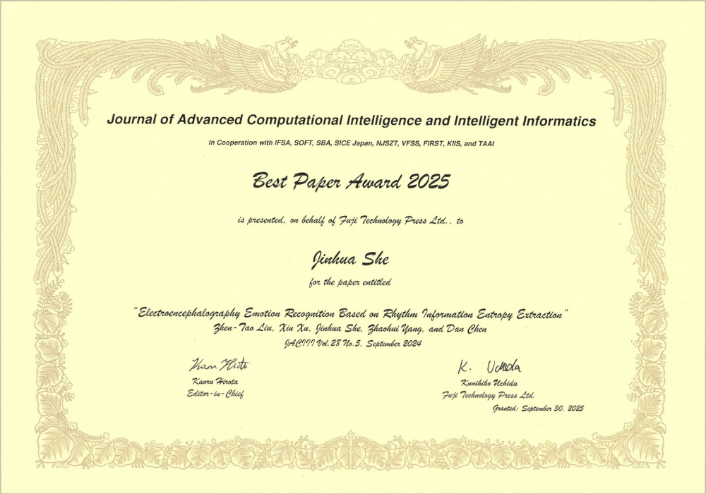 2025年9月30日、本学工学部機械工学科の佘 錦華(シャ キンカ)教授が、JACIII優秀論文賞を受賞しました。