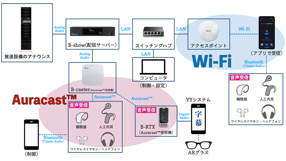 本プロジェクトは、本学メディア学部の吉岡英樹講師(聴覚障害支援メディア研究室)が、こうした公共空間で誰もがアナウンスや情報にアクセスすることができる補聴支援システムの社会実装を目指し取り組んでいるものです。イスラエルBettear社が開発し欧米を中心に60カ国以上で販売(注2)されている最新の補聴技術をベースに、Auracast™とWi-Fiのハイブリッド方式にすることで、現在普及しているほとんどの補聴器や人工内耳、ヘッドフォン等に対応する音声配信システムを構築。従来方式のような専用受信機を必要とせず受信範囲が広いため(注3)、これまで難しかった公共空間でも導入が可能となります。今年の夏から、医療関係者や聴覚障害当事者団体、補聴器や音響機器メーカーなどの協力のもと、全国各地で体験会や試験運用を実施(注4)しています。