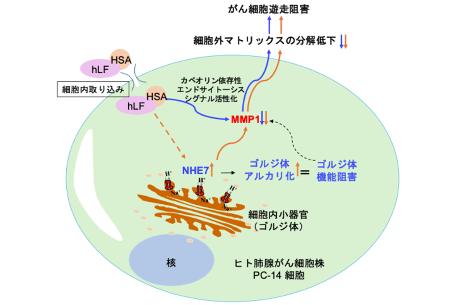 がんの転移は、患者の予後を左右する重大な臨床課題で、がん細胞の遊走(細胞移動)は、転移での重要なステップとなります。マトリックスメタロプロテアーゼ1(MMP1)は細胞外マトリックスを分解する酵素であり、がん細胞の遊走に重要な役割を果たします。同グループの先行研究では、hLF-HSA処理が、ヒト肺腺がん細胞株PC-14でのMMP1発現を低下させ、その結果、遊走を抑制することが報告されています(文献1)。本研究では、hLF-HSA処理によるMMP1発現低下は、細胞内小器官(ゴルジ体)で発現するNHE7の発現促進を介したゴルジ体のpH恒常性破綻(機能阻害)と、hLF-HSAの細胞内取り込みの際に活性化されるカベオリン依存性エンドサイトーシスシグナルによることが明らかとなりました。